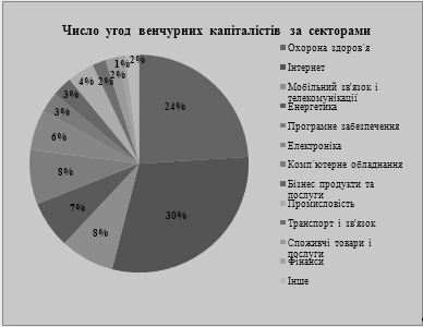 Рис.1.2. Число угод венчурних капіталістів за секторами [74] Існує два способи проводити фінансування діяльності підприємства – пряме фінансування і боргове. Боргове фінансування – це кредити банків, випуск облігацій. Пряме фінансування здійснюється, коли інвестор вносить кошти або інше майно в статутний капітал підприємства чи купує акції цього підприємства і, таким чином, одержує право на частку в майбутніх прибутках (дивіденди). Величина частки визначається величиною внеску в статутний капітал або кількістю придбаних акцій. Інвестором венчурних фондів можуть бути: - комерційні банки, які насамперед зацікавлені в зниженні своїх кредитних ризиків; - інвестиційні банки - це інвестиційні інститути, що займаються розміщенням нових випусків цінних паперів; правильніше вважати інвестиційний банк не інвестором, а фінансовим посередником; - торгові банки, що мають значний капітал, що дозволяє їм здобувати цінні папери не тільки для перепродажу, але і як об'єкт інвестицій; - інвестиційні фонди. Існує безліч різних організаційно-правових форм інвестиційних фондів. Прийнято виділяти дві основні категорії інвестиційних фондів: відкриті і закриті. - стратегічні інвестори - прагнуть придбати великі пакети акцій, фахово розбираються в специфіці роботи підприємств інвестованих, втручаються в оперативне керування ними. - венчурні капіталісти і венчурні фонди - прагнуть придбати значну частку в підприємстві (20-40%). Досвід розвинутих економічних країн у періоди промислового спаду, що стикалися з проблемами, аналогічними нинішнім вітчизняним, свідчить, що венчурні фонди можуть служити одним з ефективних засобів подолання дефіциту і дорожнечі інвестиційних ресурсів [66, с.65]. Венчурні фонди Західної Європи інвестують в економіку регіону більше 6,5 млрд. доларів на рік. Але, на відміну від американських, європейські фонди ризикового фінансування воліють вкладати кошти не в початковий, а у вже зрілий, що добре зарекомендував себе, бізнес. Головна відмінність венчурних фондів від інших інституційних інвесторів полягає в тому, що перші інвестують кошти шляхом придбання акцій підприємств, котрих вони інвестують. Більшість фондів створюється на період 7-10 років. По завершенні цього періоду фонд реалізує всі придбані корпоративні цінні папери і ліквідується. Тому венчурні фонди зацікавлені у високому котируванні акцій підприємства-реципієнта. Інвестор готовий нести великі ризики, тому венчурним фондам потрібно набагато більше часу для прийняття рішень, як правило, не менше півроку. Основною проблемою венчурного бізнесу є високий ступінь ризику при здійсненні венчурного проекту. Перед здійсненням проекту необхідно оцінити можливі інноваційні втрати. Фінансові витрати на проведення технічних заходів, часовий розрив між впровадженням нововведень і одержанням корисного результату, а також імовірність втрат від нововведень вимагають оцінки ризику інноваційних рішень. При цьому виникає необхідність чіткого розмежування очікуваних збитків, що в економічній практиці не знаходить належної уваги. Є велика кількість факторів, що впливають на формування інноваційних ризиків. Найголовнішими з них щодо венчурного інвестування є наступні: зовнішній ризик, ризик стабільності партнерства,банківський ризик, ризик стабільного постачання, ризик 
