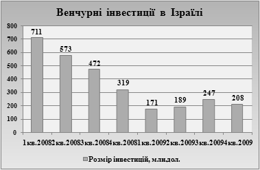 Рис. 2.3. Обсяг венчурних інвестицій в Ізраїлі за 2008-2009 рр. [15] У 2009 році на ізраїльському ринку відбулося 63 злиття і поглинання на загальну суму 2,54 млрд. дол., що на 7% нижче рівня 2008 року (2,74 млрд.). Незважаючи на падіння, середній розмір угод в 2009 році склав 40 млн. дол США, що є на 21% у порівнянні з 33 млн. дол США в 2008 році. У 2009 році ізраїльським венчурним фондам знайти залучення капіталу було надзвичайно важко, так як іноземні інституційні інвестори, які до кризи були основним джерелом капіталу, вкладеного в ізраїльські засоби, зазнали серйозних втрат через фінансову кризу. Ізраїльський венчурний капітал зріс до 229 млн.дол. у 2009 році, що становить 20% від загального обсягу капіталовкладень в ізраїльські компанії високих технологій.