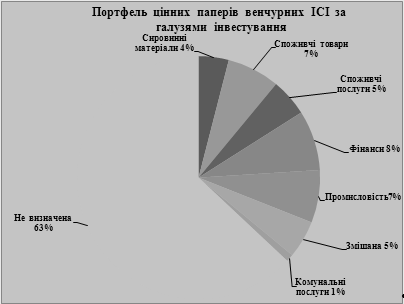 Рис. 3.1. Динаміка зростання кількості компаній з управління активами та інститутів спільного інвестування у 2002-2008 роках [49, с.22-27] Аналітики відзначають, що у відносному виразі найбільше продовжує зростати кількість відкритих ІСІ, що свідчить про зростання попиту на такі ІСІ з боку інвесторів-новачків, бо вони обирають найбільш ліквідні та найменш ризиковані інструменти для інвестування. Венчурні проекти демонструють не такі темпи зростання, натомість з самого початку венчурні компанії у більшості як корпоративних інвестиційних фондах – КІФ (відкритих, закритих, інтервальних, венчурних), так і пайових – ПІФ (закритих і венчурних). Аналогічно високі темпи характерні для емісії цінних паперів та реальної вартості активів. Зростання на 137-256% та 131-250%, тобто в рази, вражає. Деякі аналітики пов’язують це з припливом українського ж капіталу, раніше виведеного за кордон, інші вважають це природним явищем для привабливого нового фондового ринку. Характерно, що ситуація 2005 року мало вплинула на темпи надходжень прямих іноземних інвестицій в Україну: рівномірно 20-30% на рік (виняток становить тільки 2005 рік – 87%).Із 2005 року зберігається тенденція, коли майже 80% усіх фондів, у яких сконцентровано більше ніж 90% зареєстрованої емісії цінних паперів, належать до венчурних.На них в Україні не діють жорсткі умови диверсифікації. За своїм призначенням венчурні фонди відповідають європейській моделі, а не американській [54, с.83-90].На рис.3.2 наведено галузі інвестування венчурних фондів. Як видно, 63% венчурних інвестицій не визначено, тобто щодо цього напрямку відсутня звітність венчурних ІСІ. Вважається, що для українських венчурних фондів цікавими є, перш за все, сфери будівництва та нерухомості.