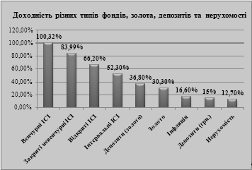 Рис. 3.3. Середня доходність різних типів фондів, золота, депозитів та нерухомості у 2007 році [48, с.87-95] За умов реформування економіки України перехід на інноваційну модель розвитку означає, насамперед, пошук нових джерел фінансування для активізації інноваційної діяльності. Венчурний капітал виявився тим органічно необхідним елементом сукупного господарського механізму, що дозволяє реалізовувати нововведення на найкритичних етапах їхнього освоєння і комерціалізації, тобто там, де інші механізми не спрацьовують. Відповідно до аналізу закордонного досвіду, венчурне інвестування не може компенсувати недостачу коштів з інших джерел для розвитку науково-технічної сфери. Венчурне інвестування є корисним у своїй конкретній "ніші" розвитку інноваційної активності господарських систем. Малий інноваційний бізнес є базою, основним живильним венчурним середовищем капіталу. На частку дрібних високотехнологічних фірм у світі припадає більше 85% обсягу коштів ризикового фінансування. Особливе місце в системі венчурного інвестування займають інноваційно орієнтовані корпорації, які здійснюють наступальну ринкову стратегію. Венчурні фонди не поспішають інвестувати кошти в акції на організованих ринках, оскільки інвестиції у фондовий ринок в Україні мають відносно низьку прибутковість при високому рівні неконтрольованих ризиків. 2006 рік став роком активного розвитку ринку спільного інвестування в Україні. Швидкими темпами зростали кількість суб'єктів ринку, вартісні показники обсягу ринку. Відчутні досягнення показав ринок і за якістю управління активами. Для української економіки - це досить швидкі темпи розвитку. Якщо у 2005 році чисті активи ІСІ у структурі ВВП складали лише 1,17%, то в 2006 році вартість чистих активів (ВЧА) ринку спільного інвестування досягнула обсягів, еквівалентних 2,6% від номінального ВВП України [70]. Отже, ринок спільного інвестування все більше проявляє себе як потужний сегмент фінансового ринку України. В той же час, збільшення капіталізації венчурних фондів в Україні на сьогодні не приводить до адекватного зростання інвестиційних потоків в інноваційні сектори економіки: спеціалізація венчурних фондів на інвестиціях в новостворені інноваційні компанії є винятковою. Основними акцепторами інвестицій венчурних фондів є компанії зі сфер нерухомості та будівництва, фінансів, харчової, хімічної промисловості, сільського господарства тощо. Основні причини такого явища: - інвестиції в інвестиції в окремі галузі традиційної економіки мають надвисокий рівень доходності за відносно короткий термін інвестування та за умов суттєво низького рівня ризику; - можливість використання організаційної форми венчурних фондів як інструменту зниження податкових витрат. 21 лютого 2008 року у Києві пройшла науково-практична конференція Української асоціації інвестиційного бізнесу (УАІБ) "Ринок інвестиційних послуг в Україні: очікування та реалії". На засіданні круглого столу на тему "Перспективи венчурної діяльності в Україні" заступником Голови Державного агентства України з інвестицій та інновацій С.Москвіним була зроблена доповідь на тему "Концепція закону України "Про венчурні фонди". Доповідач наголосив, що одним із пріоритетів інноваційної діяльності у 2008 році є удосконалення інституційної інфраструктури з