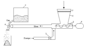1-бункер; 2-шнек; 3-клапан; 4-труба; 5-сітка; 6-електродвигун; 7-сушка Русинок 2.1 Схема дозатора Шлак засипають в бункер 1, у верхній частині якого знаходиться металева сітка 5 для відділення крупних шматочків. При видачі солі з сушарки автоматично включається шнек 2і відкривається клапан 3, шлак подається через розподільні отвори в трубі 4на сульфат амонію. Попередні випробування по подачі мартенівського шлаку перед сушаркою 7 показали неефективність цього способу, оскільки спостерігалися сильне пиління та значні втрати шлаку з викидами з сушарки (6 - електродвигун). Кількість доданого шлаку складала 0,1-0,5%. Введення шлаку в кількості, що перевищує 0,5%, впливає на вміст азоту в добриві, яке не має бути менше 21%. Ступінь злежування оцінювали наступним способом: закладали оброблені шлакому проби сульфату амонію в мішках, а також з сіллю без добавки шлаку на шестимісячне зберігання в штабелях. Після закінчення зазначеного терміну вміст мішків аналізували на розсипчастість по ГОСТ 21560.5-82. Вміст шлаку в обробленому сульфаті амонію визначали по кількості фосфору, який є одним з компонентів мартенівського шлаку. Аналіз результатів промислового випробування показав, що в процесі шестимісячного зберігання початковий сульфат амонію без добавки шлаку злежувався до моноліту, розсипчастість коливалася в межах 28,8-70,1. В той же час сіль з добавкою мартенівського шлаку вільно висипалася з мішків. Це можна пояснити тим, що тонкоподрібнений шлак роз'єднує поверхню сульфату амонію, а основні оксиди, що входять до складу шлаку нейтралізують надмірну сірчану кислоту, яка сприяє злежуванню готового продукту. Одночасно мікроелементи, що входять до складу шлаку, самі є мікродобривами. Таким чином, вміст добавки повинен складати 0,3-0,5%. При цьому якість сульфату амонію повністю відповідає вимогам стандарту, а розсипчастість складає 98,7-99,8%.[10] У лабораторних умовах випробували наступні тверді добавки: золу ТЕЦ Ясиновського коксохімічного заводу,феросплавний пил,шлам газоочистки, шлакову муку конвертерного цеху і подрібнений гранульований шлак доменного цеху, а також подрібнений силікатний пісок. З рідких добавок випробовували відходи власного виробництва: регенерований розчин ділянко сірко очистки, лужні води цехів ректифікації і смоло переробного. Витрата добавки у всіх випадках складала 0,5 %(масові долі) на суху речовину. Після обробки сульфат висушували до первинної вологи. Результати наведені у таблиці 2.1 Таблиця 2.1 Результати випробувань