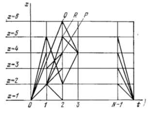 Сумма в выражении (1) распространена по всем индексам i и j , удовлетворяющим условию (α), т.е. условию, что каждый из индексов i и j входит в выражение (1) один и только один раз. Функция l = l ( x 1 , …, xN ) является, таким образом, аддитивной – она представима в виде суммы слагаемых, однако сама задача – задача отыскания минимума l – в силу ограничения (α) не является аддитивной и не удовлетворяет принципу оптимальности. Рассмотрим снова плоскость t , x , где t – дискретный аргумент, принимающий значения 0,1, 2, …, N , соответствующие этапам путешествия торговца. Значит t = 0 соответствует его начальному положению в городе номер 1, t = 1 – переходу из города номер 1 в город, который он выбрал первым для посещения, и т.д., t = N означает последний этап его путешествия – возвращение в город номер 1. Аргумент x теперь также принимает дискретные значения 1,2, …, N (Рисунок 1.1). Соединим точку (0, 1) с точками (1,1), (1, 2), …(1, N ) и длинам отрезков, соединяющих эти точки, припишем значения f ( x 1 , xj ) . Далее точки (1, s) – узлы, лежащие на первой вертикали, мы соединим со всеми уздами второй вертикали, длинам отрезков мы припишем значения f ( xs , xk ) и т.д. точки (N -1, s ) соединим с точкой (N ,1).