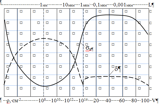 L- розмір зерна; V- % аморфної фази; ρ - щільність дислокацій; σв -межа міцності; d -пластичність до руйнування Рисунок 1.1 Залежність механічних властивостей від розміру зерна і щільності дислокацій У роботі [5], показано, що результати розрахунку анізотропії пружних властивостей полікристалічної міді без обліку впливу границь зерен відхиляються від експериментальних даних на 6%. З цього можна припустити, що в досить дрібнозернистих матеріалах границі зерен можуть значно впливати на величину ефективного пружного модуля. Ефективні значення модулів пружності залежать від структури матеріалу, тому що пластична (додаткова) деформація залежить від дефектів структури. Дослідження пружних властивостей субмікрокристалічної (СМК) - міді і нікелю показали, що формування в матеріалі цієї структури приводить до значного зниження значення модуля Юнга і модуля зрушення. Відпал СМК-зразків, що викликає повернення структури і ріст зерен, приводить до різкого повернення пружних властивостей при досягненні середнього розміру зерна близько 0,5 мкм. Це різке повернення корелює з переходом границь зерен з нерівноважного стану в рівноважне. Таким чином, чим менше розмір зерна, а також більш нерівноважні границі, тим вище у зразків внутрішнє тертя при малих амплітудах деформації і властивості міцності і тим нижче пружність. Розходження в міцності чистих металів і сплавів в залежності від їхнього структурного стану (монокристал, полікристал, нанокристал і т.п.) виникає через особливості деформаційних процесів, що протікають при навантажені в матеріалі з різними дефектами структури. В даний час теорія дислокацій найбільше повно пояснює причини формування властивостей міцності матеріалів. Існує зв'язок між напругою текучості й основних параметрів структури. Напруга деформування монокристала в загальному випадку складається із суми напруги тертя гратки σ0 , напруги полів дислокацій, що лежать у площині ковзання σд , напруги, що виникає за рахунок взаємодії дислокацій з атомами домішки σр і напруги, що виникає за рахунок взаємодії дислокацій з частками фази σф . σ =σ0 +σд +σр +σф У випадку полікристала до перерахованим вище доданків додається напруга, що враховує зміцнення від розміру зерна σз . σ =σ0 +σд +σр +σф + σз де σз - функція від розміру зерна d, що має вид k*∙bGd-1/2 , де коефіцієнт k=k*∙bG визначає опір границі зерна дислокації, що рухається. Тобто такий зв'язок звичайно добре описується за допомогою співвідношення Холла-Петча: σs =σ0 + k*∙bGd-1/2 , де σs - границя текучості. Закон Холла-Петча виявляється справедливий не тільки для полікристалів з розміром зерен від 100 до 0,1 мкм. Властивості міцності субмікро- і нанокристалічних матеріалів визначаються в основному розміром зерна в і станом границь зерен. Границя текучості субмікро- і нанокристалічного матеріалу істотно залежить від способу одержання як нанокристалічного, так і вихідного (крупнозерневого стану). Наприклад, при зменшенні розміру в від 1500 до 5 нм в чистих металах і сплавах мікротвердість Н може збільшитися від 2 до 6 разів [7]. Межа текучості σ0,2 і межа міцності σв нанокристалічних металів також зростають у порівнянні з крупнозерневим станом. При цьому низькотемпературна пластичність в зменшується. Межа текучості субмікро- і нанокристаллічних матеріалів, як і для звичайних матеріалів, залежить 