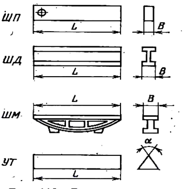 рис.6 Материалом плит обычно является серый чугун. В последние годы широкое распространение получили плиты, изготовленные из твердых каменных пород. Достоинством этих плит является то, что в них отсутствует внутреннее напряжение (камень необходимо добывать без взрыва). Твердость каменных плит значительно больше, чем твердость стали, что способствует повышенной стойкости таких плит к износу. Каменные плиты меньше подвержены деформации из-за измерения температуры окружающей среды, так как коэффициент теплового расширения ниже, чем у чугуна. Каменные плиты имеют коэффициент демпфирования в 15-20 раз выше, чем чугунные плиты, а это значит, что они менее чувствительны к возможным вибрациям. Точность плит обычно нормируется либо по числу пятен краски в квадрате с размером 25Х25 мм, либо через отклонения от прямолинейности в разных направлениях. Применение плит в большинстве случаев связано с определением плоскостности с помощью краски. Плиту покрывают тонким слоем краски (толщина слоя зависит от допуска на плоскость) и кладут на поверхность проверяемой детали. После перемещения плиты по поверхности детали (или наоборот) определяют число пятен, приходящихся на один квадрат 25Х25 мм. Погрешность проверки примерно 3-5 мкм. 2.2 Определение отклонений от плоскостности с помощью поверочных линеек Проверка плоскостности производится поверочными линейками типов: ШП - с широкой рабочей поверхностью прямоугольного сечения; ШД – с широкой рабочей поверхностью двутаврового сечения; ШМ - с широкой рабочей поверхностью, мостики; и УТ - угловые трехгранные (рис.7). Линейки с широкой рабочей поверхностью выпускают трех классов точности: 0,1,2.Линейки класса 0 применяют для проверки поверхности 4-й степени точности, класса 1- для 6-й и 7-й степени точности и класса 2- для проверки поверхности 7-й и 8-й степени точности. Размеры lxb линеек различных типов имеют следующие значения: для линеек типа ШП-205х5…630х10 мм; для линеек типа ШД-630х4…4000х30 мм; для линеек типа ШМ- 400х50…3000х110 мм. Линейки с широкой рабочей поверхностью применяют для проверки плоскостности узких поверхностей методом «на краску» и методом линейных отклонений. Угловые линейки типа УТ изготавливают длиной 400, 630 и1000 мм с двумя шабренными рабочими поверхностями, образующими угол α, равный 45, 55 и 60˚. По отклонениям граней от плоскостности эти углы делят на классы точности 0,1, и 2. Угловые линейки используют для одновременного контроля плоскостности пересекающихся поверхностями 7-й и 8-й степени точности методом «на краску». У поверочных линеек с широкой поверхностью отклонение от плоскостности находится в пределах от 2.5 до 100 мкм.