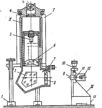 рис.11 Плоскомер состоит из неподвижной I и поворотной II частей. Неподвижная часть, устанавливаемая на измеряемую поверхность, имеет объектив 6 и микрообъектив 3. Неподвижную часть устанавливают на трех точках с помощью постоянных магнитов 1 (аналогично штативу с магнитным основанием). Положение плоскомера можно регулировать по высоте. Поворотная часть плоскомера имеет окуляр 5 с сеткой 4, пента-призму 2 и плоскопараллельную пластину 8. Визирная марка III (в комплект плоскомера входит четыре марки) содержит источник света 12, конденсор 11 и точечную диафрагму 9.Узел с этими элементами может смещаться по высоте микрометрической парой 10, а фиксироваться на измеряемой поверхности с помощью постоянного магнита 13. При измерении, как и в случае механического плоскомера, выбирают три точки на измеряемой поверхности и регулировкой опор плоскомера добиваются изображение всех трех светящихся точек в центре перекрестий сетки и прибора. После этого четвертую марку устанавливают в любую точку измеряемой поверхности и определяют отклонение ее положения от базовой плоскости по изменению изображения светящейся точки в поле зрения. Совмещение с центром сетки достигается поворотом плоскопараллельной пластины 8, а величину смещения определяют по микрометрической паре 7. 2.5 Гидравлические методы измерения плоскостности Принцип измерения заключается в сравнении плоскости, образованной поверхностью жидкости, которая всегда располагается в горизонтальном положении, с проверяемой поверхностью. 2.5.1 Метод свободно налитой жидкости Метод свободно налитой жидкости заключается в том, что на проверяемую поверхность устанавливают резервуар с жидкостью (рис.12).