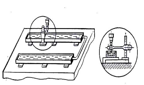 рис.12. Вместе с резервуаром в свободные места на измеряемую поверхность устанавливают стойку с закрепленной на нее микропарой, у которой конец микровинта сделан в виде иглы. Вращением микровинта измеряют размер по микропаре при соприкосновении иглы с поверхностью жидкости (момент касания замечают по изгибу мениска или по замыканию электрической цепи). По разновидности отсчетов в разных точках плоскости судят о положении одной точки поверхности относительно другой. Погрешность измерения в основном оказывает влияние непостоянство атмосферного давления на измеряемой поверхности (перепад давления в одну миллионную от нормального атмосферного давления создает разность уровней на открытой поверхности воды 0.01 мм). 2.5.2 Метод сообщающихся сосудов Метод сообщающихся сосудов реализован в специальных измерительных средствах, получивших название гидростатические уровни (рис.13).