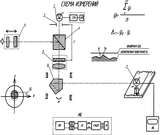 Рис.19 Функциональная схема установки для контроля плоскостности. Разработанное устройство для измерения отклонения от плоскостности представляет собой систему для контроля величины расстояния от образцовой плоскости до контролируемой плоскости, с целью нахождения погрешности формы этой плоскости. Функциональная схема установки для контроля плоскостности показана на рис.19. Устройство для измерения отклонения от плоскостности включает в себя устройство для создания образцовой плоскости и измерительного устройства. Устройство для создания образцовой плоскости, согласно техническому заданию, должен работать в видимом диапазоне для того чтобы положение этой плоскости можно было контролировать визуально. Устройство для создания образцовой плоскости состоит из: источника излучения, полевой диафрагмы, светоделительной призмы, объектива, пента-призмы и окуляра. В качестве источника излучения используется лазерный светодиод, который работает в видимом диапазоне. Полевая диафрагма используется для формирования пучка лучей. Светоделительная призма используется для разделения визуального и измерительного канала. Объектив используется для формирования параллельного пучка лучей. Вращающаяся пента-призма нужна для сканирования плоскости. Окуляр используется для наблюдения светового пятна на фотоприемнике. Измерительное устройство состоит из: приемника излучения, штатива и перемещающихся направляющих, установленных на макроповерхностях и щупа. Приемник излучения прикреплен на штатив. В качестве приемника излучения используется координатный фотоприемник. Координатным фотоприемником называется фотоприемник, по выходному сигналу которого определяют координаты светового пятна на фоточувствительной поверхности. Разработанное устройство для измерения отклонения от плоскостности работает следующим образом. Перед проверяемой деталью устанавливается устройство для создания образцовой плоскости, а на измеряемую поверхность измерительное устройство. Перед проведением измерения необходимо провести согласование образцовой плоскости и контролируемой по расположению в пространстве, по относительному заклону и начальному смещению. В качестве образцовой плоскости выбирается плоскость, полученная вращением луча относительно перпендикулярной ему оси, т.е. надо отрегулировать положение приемника таким образом, чтобы луч проходил через три точки находящиеся на максимальном расстоянии. После этого производится измерение отклонения от плоскостности. Измерение отклонения от плоскостности производится шаговым методом. Свет от источника излучения коллимируется объективом и пройдя сканирующую систему, попадает на приемник излучения. Измерительная система перемещается вдоль контролируемой поверхности. Приемник излучения измеряет смещение щупа относительно базовой плоскости. При отсутствии отклонения от плоскостности проверяемой поверхности световое пятно будет находиться в центре координатной площадки фотоприемника. Если отклонение от плоскостности присутствует, то произойдет наклон измерительного устройства. В результате световой луч, прошедший через устройство для создания образцовой плоскости, сместится на величину ∆. На координатной площадке фотоприемника световое пятно будет смещено отно