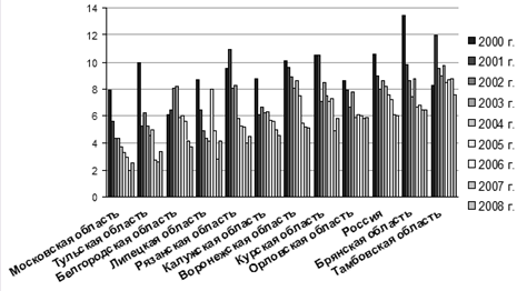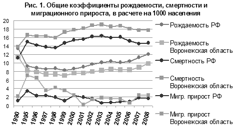Центральная России была и остается зоной наиболее сильной депопуляции, поэтому во всех областях Черноземья демографическая ситуация хуже, чем по стране в целом. В Воронежской области коэффициент естественной убыли (-7,6‰ в 2008 г.) в 3 раза превышает средний по РФ. В 2007-2008 гг. рождаемость заметно повысилась, но смертность сокращается медленно (рис. 1). В переходный период Черноземье впервые за сто лет стало зоной миграционного притока, это замедлило сокращение численности населения. Коэффициент миграционного прироста был максимальным в 1993-1994 гг. (около 12‰), он даже покрывал естественную убыль населения. Воронежская область стала одним из регионов массового расселения возвратных мигрантов из стран бывшего СССР. В начале 1990-х гг. в Борисоглебск из Средней Азии организовано переехало на постоянное место жительства около 12 тыс. человек. При финансовой помощи государства переселенцы самостоятельно строили дома, обеспечивали себя рабочими местами. Однако к 2000 г. федеральная поддержка свернулась. После завершения периода стрессовых миграций из СНГ сальдо миграций приблизилось к нулю. В последние годы коэффициент миграционного прироста в Воронежской области ненамного выше среднего по стране, но среди соседних регионов Черноземья она все же более привлекательна для мигрантов, чем Липецкая, Курская и Тамбовская, которые не имеют такого крупного регионального центра. демографический заболеваемость бюджет амбулаторный