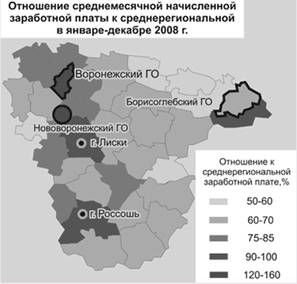 В нескольких муниципалитетах демографическая ситуация лучше, чем в среднем по области. В Нововоронеже – молодом городе, возникшем при атомной станции в 1958 г., – естественная убыль составила 3‰, в Воронеже, Россошанском и Богучарском районах - 4,5-5‰. Сильнее всего депопуляция на северо-западе области, вНижнедевицком и Репьевском районах из-за резкого постарения населения (рис. 2). Например, в Репьевском районе в 2008 г. 42% населения составляли пенсионеры. Сложная демографическая ситуация и во входящих в Воронежскую агломерацию Рамонском и Хохольском районах, где трудоспособное население в течение последних десятилетий активно перемещалось в областной центр. В последние годы наиболее миграционно привлекательны Каширский и Хохольский районы, расположенные между Воронежом и Нововоронежом, т.е. вблизи или в пределах агломерации, а также юго-восточный Калачевский район (миграционный прирост 11-13‰). Сильным миграционным оттоком выделяются Воробьевский район с самым низкой в области оплатой труда и экономически неблагополучные Бутурлиновский район и Борисоглебский городской округ.