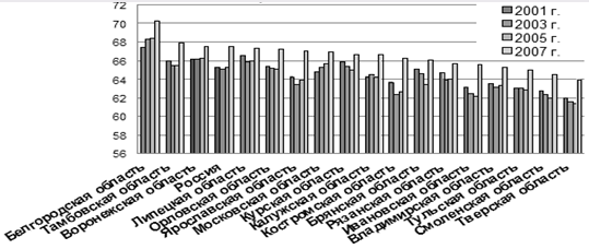Проведя анализ показателей естественного движения населения в Воронежской облалсти, на основании заранее определенных критериев оценки можно утверждать, что на протяжении всего периода исследования уровень рождаемости в данном субъекте является невысоким, в 1995 снизившись до очень низкого. В последние годы (2007-2008) наметилась тенденция к повышению уровня рождаемости. В целом, динамика рождаемости в субъекте соответствует динамике по стране. Темпы прироста рождаемости отражены в табл. 7. В 2008 году уровень рождаемости в Воронежской области был ниже, чем по стране в целом на 23,4 %. В периоде с 1995 до 2008 года уровень смертности в области находится на высоком уровне. Прослеживается тенденция к стабилизации смертности, тогда как в целом по России в последние годы она снижается. Темпы прироста смертности показаны в табл. 7. Однако, уровень смертности все равно остается выше, чем средний по стране (в 2008 г. выше на 21,2%). Возрастная структура населения Воронежской области отличается высокой долей пожилых. Старше трудоспособного возраста 25,3% населения (по стране – 21%, по ЦФО – 23,9%). На детей до 16 лет приходится только 13,8% (по РФ – на 2% больше). Ниже среднего по стране и доля трудоспособного населения – 61%. Поэтому демографическая нагрузка на 1000 трудоспособных одна из самых высоких в ЦФО (5 место) – 641 нетрудоспособный (по данным 2007 г.). В 2000-х гг. Воронежская область была одним из лидеров ЦФО по ожидаемой продолжительности жизни. Но темпы роста этого показателя невысоки, и в 2007 г. область перестала выделяться в лучшую сторону на общероссийском фоне (рис. 6).