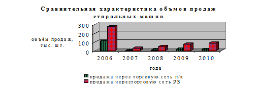 Рис 1.1 Объемы производства стиральных машин в Республике Беларусь за 2003-2010 года. Исходя из данных таблицы 1.1, необходимо отметить, что производство в Республике Беларусь развивалось скачкообразно. Так, если провести расчет темпов роста можно отметить, что в 2010 году по сравнению с 2009 годом наблюдается спад, а по сравнению с остальными годами наоборот рост производства. Спад вызван тем, что в настоящее время происходит серьёзное проникновение зарубежных производителей стиральных машин на белорусский рынок, таких как Индезит, Электролюкс, Бош, Канди и других. Они предоставляют множество функций по сравнению не большим ценам, что качественно отличает их от отечественных марок. Также иностранные модели представлены широким ассортиментом автоматических машин. В тоже время необходимо отметить, что до 2009 года в республике была тенденция стабильного роста по отношению к прошлым годам. Это показывает, что государство оказывало сильнейшею поддержку отечественным производителям, в том, что сдерживало искусственно проникновение зарубежных производителей на наш рынок. Можно отметить, что население предпочитало по привычке покупать отечественные марки стиральных машин хорошо известных марок, а также сильнейшим фактором при производстве – отсутствие сырьевой базы, и при закупке комплектующих у иностранных партнеров за иностранную валюту, которой зачастую не хватает. 1.2 Состояние рынка продаж стиральных машин в Республике Беларусь Торговля является основным источником удовлетворения спроса населения. В последнее время потребитель большее внимание обращает на магазины, особенно при выборе сложной техники. Это связано с предоставлением ряда услуг по обслуживанию техники, а также гарантии на продаваемую бытовую технику. При этом необходимо отметить, что объемы реализации всех видов техники переходит из государственной и кооперативной торговли в частную. Анализ темпов роста продаж показана в таблице 1.2.1. Таблица 1.2.1. Продажа стиральных машин в Республике Беларусь (тыс.шт.)