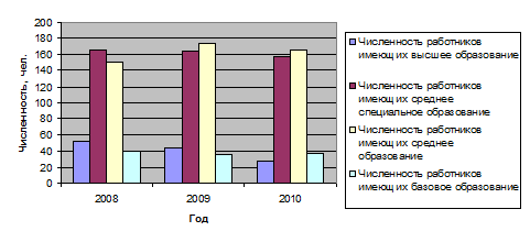 Индекс цен: 2010г. – 1,54;2010г. – 1,38. Из таблицы 2.1.1 видно, что товарооборот всех торгующих систем, в том числе и товарооборот Гродненского райпо увеличивался из года в год в действующих ценах. Следует также отметить, что темпы роста товарооборота Гродненского райпо выше темпов роста товарооборота всего района как в действующих, так и в сопоставимых ценах, поэтому доля товарооборота Гродненского райпо на рынке Гродненского района постоянно увеличивается. Так в 2010 году по сравнению с 2009 годом она увеличилась на 4,7%, а в 2010 году – на 1,8% по сравнению с 2010 годом. Эффективность любой деятельности, с точки зрения ее конечных результатов, в значительной мере зависит от квалификации работников предприятия. Развитие рыночных отношений связано также с включением в сферу предпринимательской деятельности большого количества людей, многие из которых никогда не занимались коммерческой деятельностью и не имеют необходимой экономической подготовки. В этих условиях особую актуальность приобретает экономическая подготовка высококвалифицированных кадров, владеющих знаниями основ коммерческой деятельности и способных определять стратегию и тактику предприятия с учетом требований рынка. Анализ кадрового потенциала работников Гродненского райпо позволяет дать его качественную оценку (таблица 2.1.2). Таблица 2.1.2 Качественный состав работниковГродненского райпо за 2009 – 2010гг.