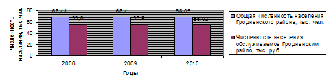 Рис. Изменение численности обслуживаемого населения. Из таблицы 2.1.3 и рис. 2 видно, что численность населения района постоянно снижается. Так на 0,51% в 2010 году уменьшилась численность населения района, по сравнению с2010 годом и на 0,06% в 2010 году по сравнению с 2009 годом. Численность населения обслуживаемого потребительской кооперацией в 2010 году увеличилась на 0,18% по сравнению с 2009 годом, что составило 81,73% в общей численности населения района, что на 0,2% больше чем в 2009 году. Однако в 2010 году потребительская кооперация не удержала своих позиций и потеряла часть потребителей (на 0,83%), в результате чего снизился удельный вес численности населения обслуживаемого Гродненским райпо в общей численности населения района. Торговля является основной отраслью потребительской кооперации. Торговые предприятия – основное звено розничной торговли. Структура розничной торговли Гродненского райпо представлена в таблице 2.1.4. Таблица 2.1.4.