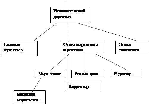 Характеризуя конкурентов среди других СМИ, делаем вывод, что конкуренты преобладают преимуществом перед продукцией «MonDilias», такими как: большое количество постоянных читателей, спрос на данные газеты растет с каждым годом, что делает их более популярными; позицию, которые занимают конкуренты на рынке, высокая. Весомый недостаток у газет «Моя Мадонна», «Телепорт», «Амурская неделя», в отличие от газет «Город» и «МК на Амуре», нецветное издание; распространение газет не по всей Амурской области, тем самым, узнаваемость газет за пределами города Благовещенска снижается. 2.3 Оценка организации маркетинговой деятельности ООО «MonDilias» Отдел маркетинга является самостоятельным подразделением ООО «Дельта- Пресс» и подчиняется исполнительному директору. Он координирует усилия сотрудников с тем, чтобы их работа была направлена на достижение общих целей и задач. Организационная структура отдела представлена на рисунке 2.2
