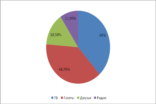 Большая часть читателей – это образованные люди со средне специальным (48%) и высшим образованием – 36,4%. Занятые в сфере здравоохранение, образования, культура, искусство – 20,7%,пенсионеры – 11,3%, студенты и учащиеся – 7,4%, работники финансовых и кредитных организаций – 7%, работники юстиции и охраны общественного порядка – 5% и т.д. Среди читателей много руководителей высшего и среднего звена – 7,7% и 8,7% соответственно, специалистов, занятых в бюджетной сфере, с высшим образованием - 11,4%, частных предпринимателей - 9%, пенсионеров – 9%,и служащих со средним образованием -- 8,6% и т.д. Большинство читателей имеют средний уровень доходов – 45,7% и выше среднего – 17,1%. Данные показатели говорят о том, что газета «Благовещенск» интересна многим кругом читателей из разных слоев населения. Общий портрет читателей газеты «Благовещенск»: Большая часть читателей – это как женщины так и мужчины, образованные, со средне специальным и высшим образованием. Занятые в сфере здравоохранение, образования, культура, работники юстиции и охраны общественного порядка. Среди читателей много руководителей высшего и среднего звена. Люди семейные, имеющий высокий доход. Так же был проведен общий опрос, для выявления потребностей в выборе рекламы. Вопрос звучал следующим образом: Где вы чаще всего, находите сведения о необходимых Вам товарах и услугах? Ответы представлены на рисунке 3