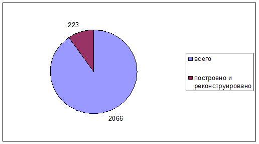 Рис.2. Структура построенных и реконструированных спортивных сооружений Положительная динамика по увеличению спортивных объектов в крае наблюдается и в 2009 г. Так, согласно проведенным статистическим данным за 2009 год общее число спортивных сооружений в Забайкальском крае увеличилось на 15%. Таким образом, в Забайкальском крае, число спортивных выросло до 2392. Из них это 635 спортивных залов, 26 плавательных бассейнов. Также выросло и число построенных стадионов на территории края до 21, что можно увидеть на рисунке 3.