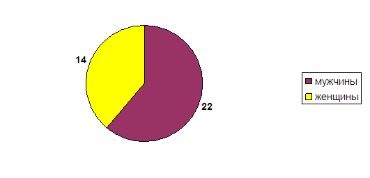 Рис.5. Структура персонала по возрасту Как уже говорилось, коллектив по профессиональной принадлежности неоднороден. Также наблюдается неоднородность по половому признаку. 61,1% коллектива организации составляют мужчины и 38,9% – женщины. Это можно объяснить тем, что большинство профессий в сфере физической культуры и спорта это мужские: оператор котельной, слесари и электрик по ремонту оборудования, заточник коньков и др. Структура персонала по полу представлена в таблице 13 и на рисунке 6. Таблица 13 Структура персонала по полу