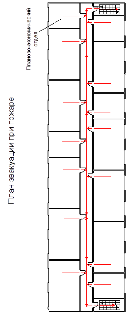 Найдём фактический воздухообмен Lф : - Lф лето = 0,5 × 0,16 × 0,583 × 3600 = 167,9 (м3 /час); - Lф зима = 0,5 × 0,16 × 1,64 × 3600 = 472,32 (м3 /час). Поскольку фактический воздухообмен как при тёплом периоде года, так и при холодном существенно больше, чем необходимый воздухообмен в данном помещении (120 м3 /час), то можно сделать вывод, что действие естественной вентиляции в отделе эффективно. Но поскольку фактический воздухообмен в летний и зимний период превышает необходимый (что может вызвать сквозняки в помещении), то можно уменьшить время проветривания в летнее и зимнее время, не ухудшив при этом показателей воздухообмена. Необходимо проветривать по 15 минут в час зимой и по 43 минуты - летом. 6.2.4 Пожарная безопасность Основными причинами пожаров могут быть: - использование неисправных электроприборов и обогревателей; - возгорание бумаги и бумажной пыли при неосторожном использование открытого огня. Помещения по пожарной безопасности в соответствии с ОНТП 24-86 [22] относится к категории Г. Так как в помещении находиться большое количество бумаги. В здании предусмотрены два пути эвакуации при пожаре протяжённостью 30 метров и 35 метров. Ширина коридоров 2 метра, что позволяет беспрепятственно выйти из помещения по ГОСТ 12.1.004-91 ССБТ[23]. В отделе присутствует пожарная сигнализация и план эвакуации при пожаре. (Рис. 6.25).