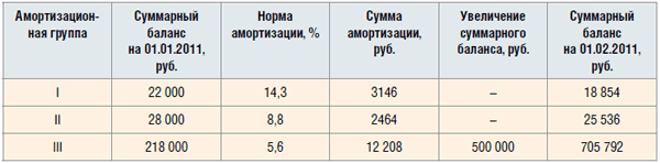 В январе 2011 года приобретен и введен в эксплуатацию новый легковой автомобиль, первоначальная стоимость – 500 000 руб. В соответствии с пунктом 3 статьи 259.2 НК РФ она включается в суммарный баланс III амортизационной группы с 1-го числа месяца, следующего за месяцем, когда он был введен в эксплуатацию, то есть с 1 февраля 2011 года. В ведомости начисления амортизации в январе 2011 года будут такие записи (фрагмент):