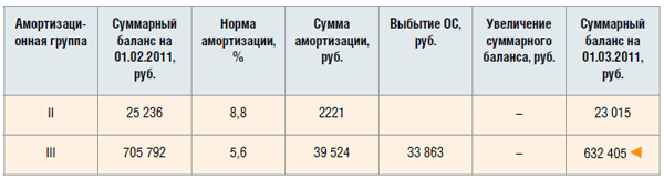Поскольку суммарный баланс I амортизационной группы на 1 февраля 2011 года составляет менее 20 000 руб., налогоплательщик вправе ликвидировать данную амортизационную группу, признав сумму 18 854 руб. внереализационным расходом согласно пункту 12 статьи 259.2 НК РФ. В феврале 2011 года старый легковой автомобиль был продан. В этом случае суммарный баланс III амортизационной группы по состоянию на 1 марта 2011 года должен быть уменьшен на остаточную стоимость этого объекта. Согласно пункту 1 статьи 257 НК РФ остаточная стоимость определяется по формуле: