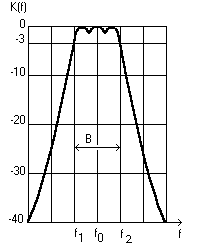 Рис. 3.5 А - характеристика, приближающаяся к частотной характеристике чувствительности человеческого уха; В, С - характеристики, использующиеся при измерении громких звуков, для которых чувствительность человеческого уха меньше изменяется в зависимости от частоты; D - характеристика, используемая при измерении шумов самолетов. По точности шумомеры делятся на четыре класса 0, 1, 2 и 3. Шумомеры класса 0 используются как образцовые средства измерения; приборы класса 1 - для лабораторных и натурных измерений; 2 - для технических измерений; 3 - для ориентировочных измерений. Каждому классу приборов соответствует диапазон измерений по частотам: шумомеры классов 0 и 1 рассчитаны на диапазон частот от 20 Гц до 18 кГц, класса 2 - от 20 Гц до 8 кГц, класса 3 - от 31, 5 Гц до 8 кГц. Для измерения эквивалентного уровня шума при усреднении за длительный период времени применяются интегрирующие шумомеры. Приборы для измерения шума строятся на основе частотных анализаторов, состоящих из набора полосовых фильтров и приборов, показывающих уровень звукового давления в определенной полосе частот. В зависимости от вида частотных характеристик фильтров анализаторы подразделяются на октавные, третьеоктавные и узкополосные.Частотная характеристика фильтра К( f ) =Uвых /Uвх представляет собой зависимость коэффициента передачи сигнала со входа фильтра Uвх на его выход Uвых от частоты сигнала f. Частотная характеристика типового октавного полосового фильтра показана на рис.3.6. Полосовой фильтр характеризуется полосой пропускания B = f2 - f1, т.е. областью частот между двумя частотами f1 и f2, на которых частотная характеристика К( f ) имеет значение (затухание) не более 3 дБ .