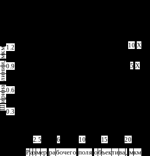 Рис. 2. Зависимость числовой апертуры объектива от размера поля изображения. Для объектива с числовой апертурой NA=0.35 при экспонировании на длине волны 300 нм глубина фокуса DF составляет менее 1.5 мкм. В этом случае неплоскостность пластин, неровный топографический рельеф, а также сама толщина резиста могут привести к невозможности получения субмикронных структур. Увеличение апертуры, к сожалению, ведет к уменьшению поля изображения, в этом случае за одну экспозицию возможно формирование лишь одного кристалла (рис. 2). Основы оптики. Размер скрытого изображения и величина краевого градиента резистных профилей ограничивается следующими основными физическими свойствами света: 1) когерентность; 2) дифракция; 3)интерференция; 4) астигматизм; 5) хроматические аберрации. В случае когерентного излучения цуги световых волн распространяются так, что их гребни и впадины согласованы по фазе друг с другом. Монохроматические световые волны, распространяющиеся случайным образом так, что их гребни и впадины не сфазированы (частично сфазированы), называют некогерентным (частично когерентным) светом. Если освещение изменяется от когерентного к частично когерентному, то контраст в передаваемом объективом изображении, эффективное разрешение и глубина фокуса изображения уменьшаются. В проекционной системе с осветителем келеровского типа источник экспонирующего излучения проецируется во входной зрачок проекционного объектива и это изображение становится эффективным размером источника. Если размер источника во входном зрачке увеличивается, то в случае протяженного источника фазовая корреляция излучения в плоскости объекта ослабевает, а дифракционные порядки идущего от предмета света увеличиваются в размере (рис.3).