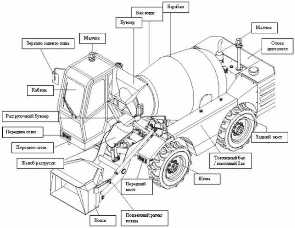 Содержание 1 История автобетоносмесителей 2 Отечественные автобетоносмесители. Принцип действия 2.1 Автобетоносмесители на базе автомобиля КамАЗ 2.2 Автобетоносмесители на базе автомобиля МАЗ 2.3 Автобетоносмесители на базе автомобиля КрАЗ 2.4 Автобетоносмесители на базе автомобиля Урал 2.5 Автобетоносмесители на базе автомобиля МКТЗ 2.6 Советские автобетоносмесители 3 Зарубежные автобетоносмесители. Принцип действия 3.1 Автобетоносмесители марки Stetter 3.2 Автобетоносмесители с самозагрузкой «Scout» 3.3 Автобетоносмеситель марки MERLO 4 Автобетоносмесители на шасси полуприцепа 5 Схемы и принцип действия основных узлов автобетоносмесителя 5.1 Система подачи воды 5.2 Типы и технологическая схема смесительных барабанов Список использованной литературы 1 История автобетоносмесителей В наше время автобетоносмесители настолько плотно и органично влились в технологический процесс строительства, что, кажется - они были всегда. Теперь ни один мало-мальски значимый объект не обходится без этого аппарата. Однако менее полувека назад миксер на колесах был диковинкой в нашей стране. Собственно, автобетоносмеситель отчасти обязан своим рождением появлению автомобиля. На начало прошлого века пришлись первые опыты по доставке на строительные объекты свежеприготовленной бетонной смеси не просто в кузове автомобиля, а в специальном устройстве, позволяющем привозить эту самую смесь в надлежащем виде, а именно сохраняющей требуемую пластичность и однородность, что в конечном итоге влияет на прочность затвердевшего бетона. Более того, индустриальные методы строительства дали толчок к созданию автомобилей-смесителей, которые способны приготовлять бетонную смесь в процессе транспортировки из заранее отдозированных компонентов. Советские конструкторы, создававшие первые автобетоносмесители, опирались на зарубежный опыт. Большое влияние на отечественную бетоно-транспортную технику оказали американские машины. Уже в начале прошлого века в США уделяли большое внимание вопросу транспортировки бетонной смеси без снижения ее качественных показателей. Первоначально выпускавшиеся в Соединенных Штатах многообразные устройства для перевозки готовой бетонной смеси и отдельно для приготовления бетонной смеси из загруженных компонентов в пути, к середине 30-х годов получили унифицированное оформление. Для этого американские фирмы - производители оборудования для механизации строительных работ стали устанавливать на шасси грузовиков герметически закрываемые горизонтальные барабаны, вращающиеся вокруг своей оси. Внутрь барабана загружалась бетонная смесь, которая перемешивалась при помощи лопастей внутри барабана. В 1935-1936 гг. в США начали выпускать унифицированные машины, как их тогда называли, автобетономешалки-развозки, предназначенные не просто для транспортировки смеси, но и для ее приготовления в пути. В 1935 году в СССР по инициативе треста "Союзстроймеханизация" была развернута техническая подготовка производства автобетономешалок и автобетоноразвозок. Ленинградский институт механизации строительства изготовил проекты двух машин, из которых одна была специализирована для перевозки готового бетона, а другая - для приготовления в пути. В 1936 и 1937 гг. серия этих машин в количестве 15 штук была изготовлена и пущена в эксплуатацию. К