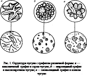 Введение Первые сведения о чугуне относятся к 6 в. до нашей эры. В Китае из высокофосфористых железных руд получали чугун, содержащий до 7% Р, с низкой температурой плавления, из которого отливали различные изделия. Чугун был известен и античным металлургам 4—5 вв. до нашей эры. Производство чугуна в Западной Европе началось в 14 в. с появлением первых доменных печей (штюкофенов) для выплавки чугуна из руд (Металлургия). Полученный чугун использовали или для передела в сталь в кричном горне (Кричный передел), или для изготовления различных строительных деталей и оружия (пушки, ядра, колонны и др.). В России производство чугуна началось в 16 в.; в дальнейшем оно непрерывно расширялось, и при Петре I Россия по выпуску чугуна превзошла все страны, но через столетие отстала от западно-европейских стран. Появление во 2-й пол. 18 в. вагранок позволило литейным цехам отделиться от доменных, т. е. положило начало независимому существованию чугунолитейного производства (при машиностроительных заводах). В начале 19 в. возникает производство ковкого чугуна. Во 2-й четверти 20 в. начинают применять легирование чугуна (Легированный чугун), что дало возможность существенно повысить его свойства и получать специальный чугун (износостойкие, корозийностойкие, жаростойкие и т.д.). К этому же периоду относится также разработка способов модифицирования чугуна. В конце 40-х гг. был получен модифицированный чугун с включениями графита шаровидной формы вместо обычной пластинчатой, что обусловливало значительно более высокую прочность металла (sь до 500 Мн/м2, или 50 кгс/мм2, в литом состоянии и 1200 Мн/м2, или 120 кгс/мм2 после термической обработки; такой чугун получил название высокопрочного). В 60-х гг. в электрических печах начали получать из стальных отходов с добавлением карбюризаторов т. н. синтетический чугун с высокими механическими свойствами при пластинчатой форме графита (Железоуглеродистые сплавы). 1.Классификация чугуна. Чугун — сплав Fe (основа) с С , содержащий постоянные примеси (Si, Mn, S, Р), а иногда и легирующие элементы (Cr, Ni, V. А0 и др.); как правило, хрупок. Характерной особенностью чугунов является то, что углерод в сплаве может находиться не только в растворенном и связанном состоянии (в виде химического соединения — цементита Fe3C), но также в свободном состоянии — в виде графита. При этом форма выделений графита и структура металлической основы (матрицы) определяют основные типы чугуна и их свойства. Классификация чугуна с различной формой графита производится по ГОСТ 3443-77. По специально разработанным шкалам оценивают форму включений графита, их размеры, характер распределения и количество, а также тип металлической основы. Классификация чугуна осуществляется по следующим признакам: · по состоянию углерода — свободный или связанный; · по форме включений графита — пластинчатый, вермикулярный, шаровидный, хлопьевидный (рис.1); · по типу структуры металлической основы (матрицы) — ферритный, перлитный; имеются также чугуны со смешанной структурой: например феррито-перлитные; · по химическому составу — нелегированные чугуны (общего назначения) и легированные чугуны (специального назначения). В зависимости от формы выделения углерода в чугуне различают: · белый чугун, в котором весь углерод находится в связанном состоянии в виде цементита Fe3C; · половинчатый ч