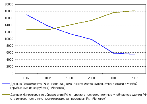 Рисунок 1. Число учебных мигрантов, прибывших из-за рубежа в РФ по данным Министерства образования и данным Госкомстата РФ (человек) Рассчитано по: "Образование России-2002", Статистический информационно-аналитический сборник, Министерство образования РФ, М., 2003, CD; Ежегодники Госкомстата России "Численность и миграция населения Российской Федерации." за 1997-2002 годы. Данные Министерства образования отражают постоянный рост численности прибывающих из-за рубежа студентов. Данные Госкомстата, напротив, указывают на равномерное и довольно быстрое снижение учебной миграции из-за рубежа России. При этом нужно отметить, что теоретически данные министерства образования в любом случае должны быть меньше, чем данные Госкомстата. Во-первых, в первом случае речь идет только студентах государственных вузов и средних профессиональных учебных заведений, старшеклассники в статистику не попадают. Более того, Министерство образования приводит цифры только относительно студентов государственных учебных заведений. В то же время, данные Госкомстата должны охватывать более широкие возрастные границы и все формы обучения. Недоучет учебных мигрантов касается не только иностранцев, но и миграции внутри России. Сопоставление данных Минобразования о числе студентов, нуждающихся в общежитии, с данными Госкомстата о числе лиц19 , сменивших место жительства в связи с учебой, показывает, что в настоящее время государственная статистика ежегодно недоучитывает как минимум 10-12 тысяч учебных мигрантов прибывших из-за рубежа (около 2/3 всего потока учебных мигрантов из-за границы) и не менее 50 тысяч человек, совершивших переезд в связи с учебой внутри России (около 20% всей совокупности учебных мигрантов).