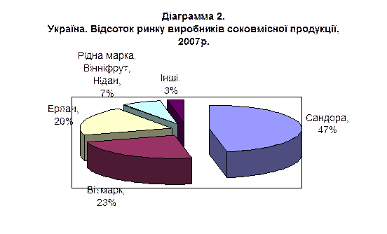 Як показує графік рис.1.1, ближче до півдня країни, дислокуються вітчизняні сокові гіганти – ТОВ “Сандора” (Миколаївська обл.), СП “Вітмарк-Україна” (Одеська обл.) та ЗАТ “Ерлан” (Дніпропетровська обл.). Локальні осередки виробництва соків розміщені в центрі та на заході України. В центрі помітний розвиток сокозаводів Житомирської та Вінницької областей. Західний дивізіон представлений регіональними виробниками – закарпатські, хмельницькі, чернівецькі, львівські підприємства. Серед регіоналів помітні соковики з високим потенціалом: компанія “Майбел” (Сімферополь, Крим), херсонські овочеконсервні заводи. Біля 92% українського ринку зосереджено в руках трьох консорціумів. Залишившийся сегмент ринку розділяють між собою декілька десятків гравців (імпортери в тому ж числі), які оперують більш як півсотнею “соковитих” марок. ТОВ “Сандора” (Миколаїв) - безумовний соковий лідер, контролюючий 47 % сокового ринку. Найбільш відомі бренди: “Сандора Ексклюзив”, “Сандора Морс”, “Сандора Мультиактив”, “Сандора Класика”, “Сандорик”, “Садочок”, “Дар”. СП “Вітмарк-Україна” (Одеса)– другий гравець в ринковому табелі рангів, який займає 23% сокового ринку України. Найбільш відомі бренди: “Джаффа”, “Соковита” та “Чудо Чадо”. Частка ЗАТ “Ерлан” (ТМ “Соки Біола” (Дніпропетровськ) тримається в межах 20 %. Спільна частка компаній “Рідна марка” (Київська обл.), “Вінніфрут” (Вінницька обл.) та “Нідан +” (Закарпаття) складає близько 7%. Економічна криза майже не позначилася на стратегічних планах транснаціональних водних гігантів — на відміну від локальних гравців, у них досить коштів для подальшої експансії. «Великі іноземні компанії мають шанс не лише зберегти свою частку ринку, а й наростити обсяги реалізації», — стверджує маркетинг-директор сокового бізнесу компанії «Кока-Кола Україна» Ірина Безкровна.