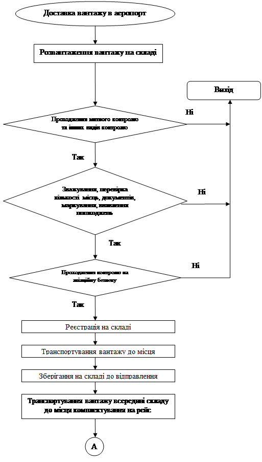 1. Диспетчер оперативної групи отримує повідомлення про прибуття ПС та його комерційне завантаження. Після прибуття ПС диспетчер отримує дані про посадку ПС і номер стоянки. Назначається бригада вантажників, які направляються до ПС. 2. Розвантаження вантажу з літака, передача документації. При цьому перевіряються дані, зазначені у документах та фактичні дані, а також відбувається огляд прибувшого вантажу на наявність пошкоджень. При необхідності складаються відповідні акти. 3. Завантаження вантажу на внутрішньо аеродромні транспортні засоби, транспортування вантажу до складу, розвантаження вантажу на складі. 4. Прийомоздавач приймає вантаж по документах, звіряє фактичну кількість місць, з вказаною у документах, вантаж зважується, перевіряється його упаковка на наявність пошкоджень. Вантаж реєструється в базі даних надходжень і видачі вантажів. Йому назначається місце тимчасового зберігання до видачі. 5. Транспортування вантажу всередині складу до місця тимчасового зберігання (в зону A*) та короткострокове зберігання вантажу перед видачею вантажоодержувачу. Повідомлення вантажоодержувача про прибуття вантажу. Перевезення вантажу всередині складу до зони прийому та видачі вантажів R. 6. Проведення остаточних розрахунків за перевезення та видача вантажу вантажоодержувачу. Вантажоодержувач перевіряє фактичну кількість місць, з вказаною у документах, перевіряє вантаж на відсутність пошкоджень. 7. Завантаження вантажу на ТЗ вантажоодержувача та вивіз вантажу з ВКА. 8. Списання вантажу зі складу.