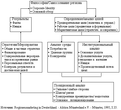 Рисунок 1 - Уровни маркетинга регионов Эмпирические исследования показывают следующие главные цели регионального маркетинга: 1. Улучшение/сохранение конкурентоспособности расположенных в регионе предприятий промышленности и сферы услуг. 2. Улучшение степени идентификации граждан со своей территорией проживания. 3. Привлечение в регион новых предприятий. 4. Создание уровня известности выше регионального (национального). Цели второго ранга: улучшение управления, повышение культурной привлекательности и улучшение инфраструктуры региона. Наконец, речь идёт о том, чтобы наряду с "жесткими" факторами размещения укоренить в сознании целевых групп и усилить "мягкие" факторы. Достижение этих целей позволяет использовать становящиеся все ограниченнее ресурсы с большей пользой и большей ориентацией на целевые группы. При этом подразумевается решение следующих задач: - созвучие трех основных функций территории - как места жительства, как места отдыха (природная среда) и как места хозяйствования. Возможные конфликты интересов групп, представляющих эти функции, решаются за одним столом в ходе дискуссий; - как можно более точная формулировка отдельных признаков, по которым будет оцениваться регион; - необходимо, чтобы цели регионального маркетинга работали на перспективу, но, с другой стороны, были реально достижимыми; - содержание маркетинга региона должно как можно раньше быть объяснено и доведено до граждан; - ориентированное на интересы граждан и инвесторов поведение региональных органов власти и управления как базисная предпосылка маркетинга региона; - маркетинг городов и других населенных пунктов должен являться составной частью общего регионального маркетинга. 1. 2. Планирование и реализации Регионального Маркетинга , его целиПри разработке и проведении концепций РМ используются подходы, аналогичные используемым в сфере маркетинга предприятий (см. рис. 2) Регион находится на пересечении требований различных целевых групп (туристов, уже имеющихся предприятий, населения, стремящихся к размещению в регионе новых предприятий). Общее внутреннее самосознание жителей служит при этом базой для достоверного внешнего выступления региона вовне. На основе этих исходных пунктов, систематических исследований восприятия региона со стороны и изнутри он профилируется и позиционируется (третий шаг). Позиционирование - это не лозунг типа "мы - экономически мощный регион с гармонично развитой окружающей средой и высоким уровнем культуры". Это также не концентрация только на преодолении своих слабых сторон (иначе можно напрасно растратиться). Позиционирование - это усиление сильных сторон региона, причем не только и не столько тех, которые были сильными в прошлом, сколько тех, которые, опираясь, естественно на достигнутое, направлены в будущее. Успешное позиционирование должно ясно отличаться от конкурирующих регионов и быть долгосрочно защитимо. Существует опасность быстрого подражания, имитации со стороны других регионов. (особенно в политике коммуникаций). В этой связи важно видеть, что профилирование региона всегда должно рассматриваться только относительно конкурентов и может стать удачным только тогда, когда у целевых групп укрепилось непротиворечивое и вызывающее доверие представление о регионе. Для успеха профилировани