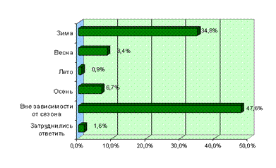 Диаграмма 2 - Популярность замороженных продуктов по видам в Липецкой области, % от числа опрошенных респондентов. Спрос на замороженные овощи подвержен сильным сезонным колебаниям. Так, на зимние и первые весенние месяцы, когда ощущается нехватка и дороговизна свежих овощей на прилавках, приходится пик продаж. Летом потребительский спрос значительно снижается, что связано со сбором нового урожая свежих овощей, и опять начинает свой рост с октября. Согласно результатам исследования липецкого рынка замороженных овощей, проведенного компанией среди покупателей данного вида продукции, в Липецке почти половина приверженцев замороженных овощей потребляет их круглый год, вне зависимости от сезона (диаграмма 6). Кроме этого, в последние годы эксперты отмечают постоянное уменьшение глубины спада объемов продаж в летние месяцы, что свидетельствует о том, что доля потребителей замороженных овощей и фруктов увеличивается не только в сезон пикового потребления, но и в период спада, а количество покупающих замороженные овощи круглый год будет расти.