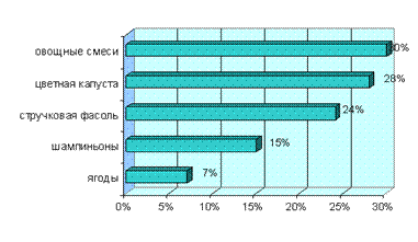 Диаграмма 3 - Сезонность потребления замороженных овощей в Липецкой области, % от числа потребителей. Наиболее популярными на рынке замороженных овощей, грибов и ягод в целом по Липецкой области являются овощные смеси –им отдают предпочтение около 30% липчан (диаграмма 4). Цветную капусту покупают 28% потребителей, стручковую фасоль – 24% и шампиньоны -15%
