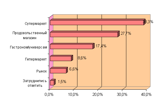 Диаграмма 4 - Популярность замороженных продуктов по видам на липецком рынке, %. Результаты проведенных исследований свидетельствуют, что главными факторами выбора для покупателей являются вкус и качество “заморозки”. Ни известность марки, ни объемы производства не являются важными показателями для покупателей. Под качеством понимается соблюдение пропорций в смеси, высокое качество ингредиентов, количество льда в упаковке, отсутствие посторонних элементов в упаковке (например, веточек, листочков и травинок в ягодах или грибах). Поэтому при выборе большинство покупателей руководствуются прошлым положительным опытом приобретения данных продуктов. Основным местом покупки замороженных овощей, согласно результатам исследования липецкого рынка замороженных овощей среди покупателей данного вида продукции, является супермаркет – 38,3% (диаграмма 5). Данный факт объясняется высоким уровнем доходов целевой аудитории, которая предпочитает покупать продукты в крупных торговых точках.