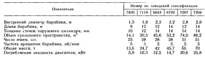 Общий объем сушильного барабана V= 77,82+ 4,86 = 82,68 м3 . Далее по справочным данным [2, 3] находим основные характеристики барабанной сушилки – длину и диаметр. В таблице 2 приведены основные характеристики барабанных сушилок, выпускаемых ; заводами «Уралхиммаш» и «Прогресс» [6]. По таблице выбираем барабанную сушилку № 7208 со следующими характеристиками: объем V = 86,2 м3 , диаметр в = 2,8 м, длина l= 14 м.