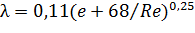 Где V = 8.92 * 1.4 = 12,43; d = 0,796 м. Примем диаметр в = 800 * 15 мм, ωтр = 24,73 м/с. Температура воздуха на входе в сушилку 273 О С, на выходе из рукавного фильтра примем t = 70 О С. Средняя температура: tср = (273+70)/2 =171,5 О С. ρ=1,04 кг/м3 [2] μ=2,2*10-5 Па*с Re = (24,73*0,8*1,04)/2,2*10-5 = 9,35*105 Примем, что трубы были в эксплуатации и имеют незначительную коррозию. Тогда ∆=0,15 мм. Получим: e = 1,5*10-4 / 0,77 = 1,95*10-4 , 10/e = 51282< Re = 935000< 560/e = 2871795. Так как Re попадает в этот промежуток, расчет λ следует проводить для смешанного трения: