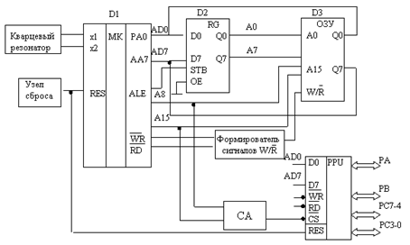 | Содержание Введение 1. Структурная схема системы 1.1 Анализ технического задания 1.2 Структурная схема устройства 1.3 Описание микроконтроллера ATmega161 2. Разработка и описание схемы 2.1 Процессорный блок 2.2 Расчет ОЗУ 2.3 Описание адаптера параллельного интерфейса 2.4 Программирование адаптера параллельного интерфейса Вывод Список использованной литературы Приложение А Введение В настоящее время происходит очень быстрое развитие компьютерных технологий. Большинство цифровых систем строится на микропроцессорах или на микроконтроллерах. Управление различными технологическими процессами происходит при помощи микропроцессорных систем или при помощи технологических операций. Данные системы практически универсальны, так как они имеют очень высокое быстродействие и достаточную разрядность для обработки информации на производстве. Микропроцессор представляет собой функционально законченное устройство, состоящее из одной или нескольких программно-управляемых БИС и служит для выполнения операций по обработке информации и управления вычислительным процессом. Центральное место в структуре микропроцессорного устройства занимает микропроцессор, который выполняет арифметические и логические операции над данными, программное управление процессором обработки информации, а также организует взаимодействие всех устройств, входящих в систему. Для реализации устройств обработки информации (УОИ) используют аппаратные, программные, программные и аппаратно-программные средства. При аппаратных получают устройство обработки информации с "жесткой" логикой, что обеспечивает наибольшее быстродействие, но требует большие аппаратные затраты. При программных УОИ реализуется в виде программы для типовой универсальной микро-ЭВМ, предназначенной для встраивания непосредственно в разрабатываемые блоки. При аппаратно-программных предполагается разработка как программных, так и аппаратных средств на базе микропроцессоров (МП). В данной расчетно-графической работе будет рассмотрен микроконтроллер ATmega161. Для этого необходимо знать архитектуру БИС и микропроцессорного комплекта, представлять взаимодействие БИС в системе и овладеть программированием, прежде всего на языке ассемблера. 1. СТРУКТУРНАЯ СХЕМА СИСТЕМЫ 1.1 Анализ технического задания Необходимо разработать микропроцессорную систему обработки данных на базе микроконтроллера ATmega161. Система кроме процессорного блока включает блок памяти, информационная емкость ОЗУ которого составляет 1К´16 бит. Блок периферийных устройств представлен регистрами защелками и дешифратором. Регистр-защёлка D2 служит для выделения младшего байта адреса по сигналу ALE. Селектор адреса СА служит для адресации адаптера параллельного интерфейса i8255. 1.2 Структурная схема устройства Система состоит из микроконтроллера ATmega162, порты которого используются для вывода адреса ОЗУ, подключен адаптер параллельного интерфейса i8255. Взаимодействие микроконтроллера с внешней памятью и периферийными устройствами осуществляется по шине адреса. Данные передаются и принимаются микроконтроллером по шине данных. Управляющие сигналы передаются по шине управления. ОЗУ подключены своими адресными входами к шине адреса и передают и принимают данные по шине данных. Адрес формируется на контактах портов РА – 8 мл