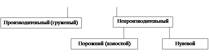 Рис.5. Транспортный процесс обслуживания нескольких производственный структур. Для планирования, учета и анализа работы ПС установлена система технико- эксплуатационных показателей (ТЭП), позволяющих оценивать эффективность использования автомобилей и результат их работы. Списочным парком автотранспортной организации (АТО) называется весь подвижный состав, числящийся на балансе предприятия: Асп =Ат +Ар , где Ат - число автотранспортных средств (АТС), готовых к эксплуатации; Ар – число АТС, требующих ремонта или находящихся в ремонте или техническом обслуживании Ат =Аэ +Ап , где Аэ – число АТС, находящихся в эксплуатации (на линии), Ап – число АТС, находящихся в простое из-за отсутствия работы, топлива, водителей и по другим организационным причинам. Для учета использования парка за определенный период времени используют показатель «автомобиледень »- АД. Например, если в течение пяти дней в АТО 20 АТС работали на линии, 2 находились в ремонте, и один простаивал, то списочные автомобиледни равны АДсп = АДэ + АДр + АДп = 20*5 + 2*5 + 1*5= 115. Эффективность работы парка ПС удобно оценивать рядом коэффициентов. Коэффициент технической готовности определяет долю исправного (готового к эксплуатации) ПС в парке и характеризует техническое состояние парка АТС: αт = Ат / Асп = АДт / АДсп = Дт / Дк , где Дт - дни пребывания АТС в готовом для эксплуатации состоянии; Дк - число календарных дней. Коэффициент выпуска характеризует долю парка ПС, находящихся в эксплуатации (на линии), относительно календарного времени: αв = Аэ / Асп = АДэ / АДсп = Дэ / Дк , где Дэ - число дней эксплуатации. Коэффициент использования характеризует долю парка ПС, находящихся в эксплуатации (на линии), относительно рабочего времени: αи = Аэ / Ар = Дэ / Др , где Др - число рабочих дней за рассматриваемый календарный период. Пробегом называется расстояние, проходимое ПС за определенный период времени. Классификация различных видов пробега грузового ПС представлена на рис.6. Нулевой пробег - это пробег, который необходимо совершить ПС для прибытия из АТО на первый пункт погрузки и возвращения после последней погрузки в АТО.