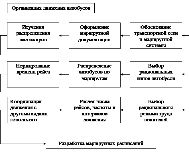 Рис.1. Схема основных работ по организации работы автобусов на городских маршрутах. Выбор и обоснование автобусных маршрутов . Установление автобусных маршрутов- выбор и обоснование рациональной трассы, направления движения, конечных пунктов и промежуточных остановок- производится с особой тщательностью и с должным технико-экономическим обоснованием, поскольку система автобусных маршрутов оказывает постоянное и значительное влияние на качество обслуживания пассажиров, удобства поездки, скорость доставки и безопасность движения, так и на эффективность использования автобусов, режим труда водителей и уровень доходов автотранспортных предприятий. Высокая эффективность автобусного маршрута достигается при выборе рациональной трассы, характеризующейся прямолинейностью и высокой сменяемостью пассажиров в пути следования. Отношение протяженности маршрута к средней дальности поездки пассажиров на данном маршруте называется коэффициентом сменности пассажиров Ксм