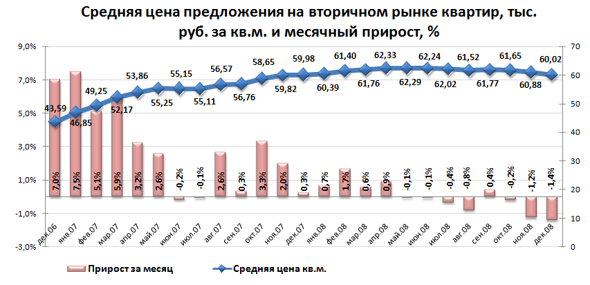 Рынок недвижимости: итоги 2008 года, прогнозы на 2009 год Ушедший 2008 год стал годом серьезных перемен для рынка недвижимости, и теперь пришла пора подвести его итоги и построить планы на 2009 год. Сейчас многие участники этого рынка испытывают недостаток достоверной информации о рынке недвижимости, поскольку находящиеся в открытом доступе индикаторы его развития, такие как средняя цена и объем предложения, уже не отражают реальных тенденций его развития. Анализ цен сделок становится очень важной частью анализа рынка недвижимости, поскольку в условиях стагнации и сокращения платежеспособного спроса, с рынка начинают уходить только те варианты, которые обладают определенными характеристиками. Именно эти объекты и составляют рынок недвижимости на фоне большого объема предложения неликвидных объектов, которые фактически не имеют шанса быть проданными. Жилая недвижимость Первые признаки смены тенденций на этом сегменте рынка стали проявляться еще летом 2007 года: тогда в результате взрывного роста цен, наблюдавшегося со второй половины 2006 года, рынок недвижимости несколько перегрелся и рост цен на жилье значительно замедлился. Осенью 2007 года рынок жилой недвижимости настигла первая волна мирового финансового кризиса: многие коммерческие банки резко сократили объем выдаваемых ипотечных кредитов, а условия их выдачи были ужесточены. Несмотря на это, доходы населения продолжали расти, за счет чего на рынке сохранялся достаточно большой объем сделок с жилой недвижимостью.