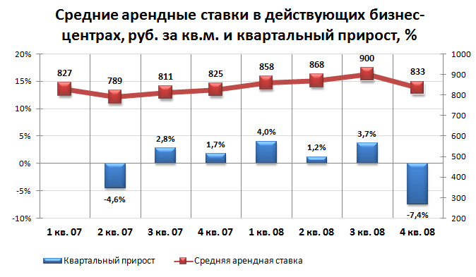 Средняя арендная ставка в действующих бизнес-центрах города Новосибирска начала снижаться лишь в 4 квартале 2008 года, выйдя при этом на уровень конца 2007 года.