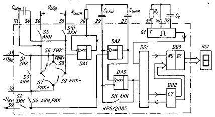 Рис. 2.4. Принципиальная схема преобразователя КР572ПВ2А На вход преобразователя (выв. 30 и 31) подают измеряемое напряжение Uвх , а на выв. 36 и 35 – образцовое Uобр . Цикл измерения (рис. 2.5.) состоит из трех этапов – интегрирования сигнала, т.е. зарядки интегрирующего конденсатора (ЗИК), разрядки интегрирующего конденсатора (РИК) и автоматической коррекции нуля (АКН). Каждому этапу соответствует определенная коммутация элементов преобразователя, выполняемая выключателями S1-S11 на транзисторах структуры МОП. На схеме рис. 1 надписи у выключателей обозначают этап, в течение которого «контакты» замкнуты. Длительность этапа, точно задаваемая счетчиком DD2 пропорциональна периоду тактовой частоты fт .