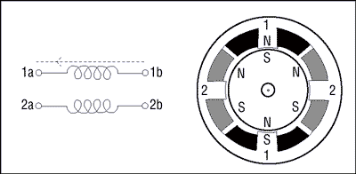 Биполярные шаговые двигатели с постоянными магнитами и гибридные двигатели сконструированы более просто, чем униполярные двигатели, обмотки в них не имеют центрального отвода (см рис.2.2.2).