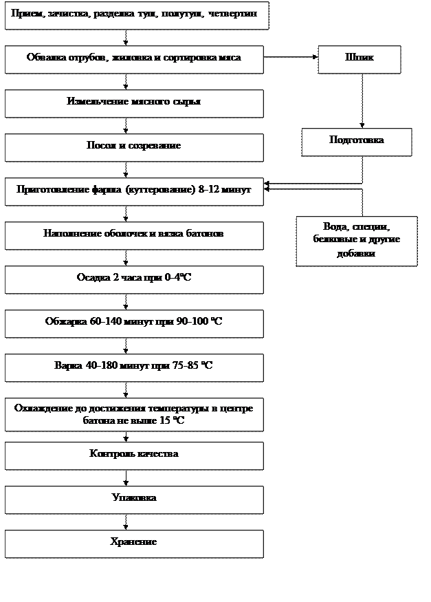 Колбасные изделия вырабатывают в соответствии с требованиями ГОСТа и технологических инструкций с соблюдением ветеринарно санитарных правил. В зависимости от качества сырья вареные колбасные изделия подразделяют на высший, 1, 2, 3-й сорта. Все виды сырья должны соответствовать санитарно-гигеническим требованиям. Сырье должно быть получено от здоровых животных, свежим, не иметь признаков микробиальной порчи и прогоркания жира. Мясо и субпродукты вынужденного убоя и условно годные можно использовать только после обезвреживания. Для большинства вареных колбас предпочтительно использовать мясо II категории и нестандартное в парном состоянии, когда оно обладает водосвязывающей способностью. Для сырокопченых колбас наилучшим сырьем является мясо бугаев, содержащее незначительное (3…4%) количество внутреннего жира. Свинина, используемая для изготовленных солено-копченых изделий, не должна быть мороженной, хранившейся более трех месяцев и после вторичного замораживания. Не используют мясо хряков, подсосных и супоросных маток. Толщина шпика в соленых продуктах ограничивается. Поэтому лучше использовать мясную и беконную свинину. При наличии шкуры на мясе на ней должна быть тщательно удалена щетина, а поверхность опалена. Кровь для выработки колбасных изделий используют дефибрированную и стабилизированную, полученную от здоровых животных. Кроме мяса и животных жиров при выработке колбасных изделий используют пищевые продукты животного и растительного происхождения. Например, молоко, сливочное масло, сыр, яйца (или меланж) в целях повышения их пищевой ценности. Для увеличения водосвязывающей способности и снижения себестоимости используют соевый изолят, концентрат, соевую и пшеничную муку, крахмал и др. Специи и пряности добавляют в фарш для придания своеобразного вкуса и запаха. Их нужно употреблять в свежеприготовленном виде, так как в процессе хранения они утрачивают аромат и вкус. 3 ТЕХНОЛОГИЯ ПРОИЗВОДСТВА ВАРЕНЫХ КОЛБАС ИЗ КОНИНЫ Колбасные изделия – готовые к употреблению мясные продукты из колбасного фарша, в оболочке или без нее, подвергнутые тепловой обработке или ферментации. Предварительно проводят посол мясного фарша и его выдержка, или посолу подвергается мясо в кусках, которое затем измельчается до фарша. Нитритный посол для некоторых изделий может не использоваться (традиционные ливерные колбасы, паштеты, студни, некоторые зельцы). Колбасный фарш получают из различных видов мяса, в основном из говядины и свинины. В его состав входят пряности, пряные овощи, виноматериалы (в рецептуры некоторых сырокопченых изделий) и других. В изделиях, вырабатываемых в соответствии с ТУ, широко используются белковые препараты, углеводные добавки и другие ингредиенты. К термической обработке колбасных изделий относятся вареные изделия (колбасы, сосиски, сардельки, шпикачки и мясные хлебы), фаршированные полукопченые, варено-копченые, сырокопченые, ливерные и кровяные колбасы, а также зельцы, мясные студни, холодец и паштеты. Колбасные изделия вырабатывают в соответствии с требованиями ГОСТа и технологических инструкций с соблюдением ветеринарно-санитарных правил. В зависимости от качества колбасные изделия делятся на высший, I, II, III сорта. В то же время технология каждого вида имеет свои специфические особенности