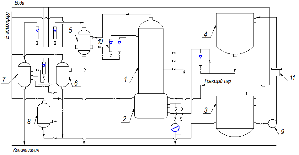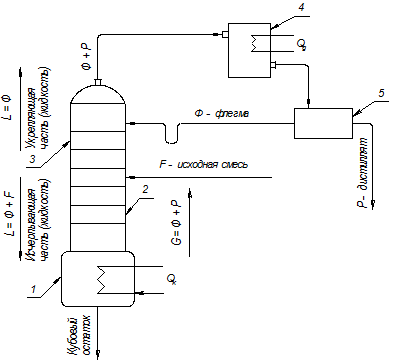 1-кипятильник (куб-испаритель); 2-исчерпывающая часть колонны; 3-укрепляющая часть колонны; 4-дефлегматор; 5-флегмоделитель; 6-контактные тарелки.Рисунок 1 - Схема работы ректификационной колонныПуск установки проводить в присутствии учебного мастера и под его непосредственным руководством. Работая на площадках с высокой отметкой и вблизи вращающихся частей проявлять осторожность и аккуратность. Включение трубчатых электронагревателей производить стоя на диэлектрическом коврике. При отборе проб пара необходимо помнить, что на входе в пробоотборник он имеет температуру около 100о С. К выполнению лабораторной работы студенты допускаются только после прохождения инструктажа по безопасности труда и пожарной безопасности в лаборатории и на рабочем месте. 2 Описание установки и порядок выполнения работы Исходная смесь хранится в баке-хранилище 3, из которого насосом 9 через фильтр 11 подается в напорный бак 4. Из напорного бака 4 исходная смесь самотеком через ротаметр поступает в подогреватель, расположенный в кубе 2, где она нагревается кубовым остатком. Температуру исходной смеси после подогрева определяют по показанию термометра. В ректификационную колонну 1 подогретая исходная смесь поступает на 7, 9 или 11 тарелку, считая сверху. Колонна имеет 12 ситчатых тарелок с сегментными сливными устройствами. Внутренний диаметр колонны 200мм. Для визуального наблюдения за процессом барботажа имеется смотровое окно. С нижней тарелки жидкость стекает в куб-испаритель 2, имеющий внутри змеевик, обогреваемый паром. Конденсат греющего пара из змеевика отводится в канализацию через конденсационный горшок. Расход греющего пара регулируется вентилем, а давление определяется по манометру. В кубе-испарителя часть жидкости превращается в пар, а другая отводится в качестве кубового остатка. Кубовый остаток проходит холодильник 7, где охлаждается водой, и поступает в сборник 8. Из сборника 8 кубовый остаток возвращается в бак-хранилище 3. Сборники 6, 8 и межтрубное пространство дефлегматора 5 сообщены с атмосферой, что обеспечивает работу колонны под атмосферным давлением. С верхней тарелки колонны пар, обогащенный низкокипящим компонентом, поступает в дефлегматор 5, который охлаждается водой. Расход воды измеряется ротаметром, а температура ее на входе и выходе – термометрами. Жидкость, образовавшаяся в дефлегматоре после полной конденсации пара, делится на две части. Одна в виде флегмы подается на орошение колонны, а другая отбирается в виде дистиллята, который поступает в сборник 6 и далее направляется в бак-хранилище 3. Количество флегмы и дистиллята измеряется ротаметрами. Колонна оборудована пробоотборниками жидкости с тарелок, флегмы, дистиллята, жидкости в кубе, а также пробоотборниками пара, поступающего на тарелку, и покидающего пенной слой. Пробоотборники пара снабжены теплообменниками типа «труба в трубе», в которых проба пара конденсируется, и конденсат собирается в бутылочки с пробками. На каждой тарелке колонны установлены датчики температуры, работающие в комплекте со вторичным прибором. Знание температуры жидкости на тарелках позволяет определить профиль температуры по высоте колонны. Перед пуском установки необходимо подать поду в дефлегматор, холодильник кубового остатка и в теплообменники на пробоотборниках пара. Отк