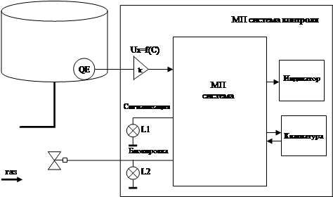 # OUT 1 = Р1.1 – номер линии для управления сигнализацией; # OUT 2 = Р1.2 – номер линии для управления блокировкой; "1" + "*"– комбинация нажатия кнопок для сброса блокировки. 1 ОПИСАНИЕ НАЗНАЧЕНИЯ И УСТРОЙСТВА МИКРОПРОЦЕССОРНОЙ СИСТЕМЫ КОНТРОЛЯ Микропроцессорная система контроля служит для индикации значения концентрации и режима работы системы, сигнализации превышения предельно допустимого значения концентрации, автоматического отключения (блокировки) подачи газа при превышении концентрации в течение заданного времени, сброса блокировки и подачи газа по команде с клавиатуры при допустимом значении концентрации. Микропроцессорная система контроля состоит из микропроцессорной системы, клавиатуры, индикатора, двух сигнализирующих лампочек (L1 «сигнализация», L2 «блокировка») и усилителя. Термокондуктометрический газоанализатор соединен через усилитель с первым входом микропроцессорной системы. Сигналом с клавиатуры, поступающим на второй вход микропроцессорной системы, можно осуществлять включение или выключение электромагнитного клапана и сброс блокировки. Первый выход микропроцессорной системы подключен к сигнализирующей лампочке L1 «сигнализация». Второй выход микропроцессорной системы соединен с сигнализирующей лампочкой L2 «блокировка» и электромагнитным клапаном, служащим для подачи газа в аппарат. Третий и четвертый выходы микропроцессорной системы соединены с клавиатурой и индикатором. 2 ОПИСАНИЕ ФУНКЦИОНАЛЬНОЙ СХЕМЫ МИКРОПРОЦЕССОРНОЙ СИСТЕМЫ КОНТРОЛЯ