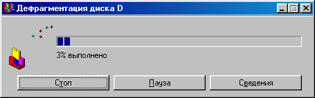Рис. 4. Диалоговое окно “Дефрагментация диска” Кнопка “Стоп” позволяет остановить этот процесс. Щелкнув по ней, Вы увидите маленькое окно, предлагающее продолжить дефрагментацию, либо выбрать другой диск для работы, либо завершить работу с утилитой. Кнопка “Пауза” служит для временной приостановки работы программы. После щелчка по этой кнопке она изменит свое название на “Продолжить”. Нажав кнопку “Сведения”, Вы сможете наблюдать за процессом дефрагментации. В окне можно увидеть, как перемещаются файлы к началу диска, освобождая место в конце. Кнопка “Легенда” выводит на экран окно с информацией о том, что обозначают блоки разных типов. Программа “Дефрагментация диска” может выполняться и в фоновом режиме (т.е. во время работы приложений Windows), но в таком случае она будет вынуждена стартовать заново каждый раз, как только Вы попытаетесь записать в каком-нибудь приложении информацию на диск. Поскольку дефрагментация может занять довольно много времени, лучше всего запускать ее, допустим, во время обеденного перерыва. Заключение Каждые полчаса в мире появляются всё новые и новые программы. Какие-то из них останутся неизвестными, какие-то получат мировое признание. Создание программного обеспечения для персональных компьютеров за какой-то десяток лет превратилось из занятия программистов-одиночек в важную и мощную сферу промышленности. Поэтому развитие ПО, предназначенного для широкого круга пользователей, происходит уже не в состязании индивидуальных программистов, а в процессе ожесточенной конкурентной борьбы между фирмами – производителями. Помимо этого, создание новых программ влёчёт за собой развитие новых комплектующих, способных полностью покрыть все требования программы, необходимые для нормального её функционирования. Использованная литература 1. Леонтьев В.П. ПК: универсальный справочник пользователя Москва 2000. 2. Фигурнов В.Э. IBM PC для пользователя, изд.5-е С.-Перетбург, АО «Коруна» 1994. 3. Каталог «Весь компьютерный мир» декабрь 1995. 4. Прейскурант «ТелеКом Ростов» Ростов на Дону, сентябрь 2001. 5. Информатика, учебник под ред. Макаровой Н.В. ─ М. Финансы и статистика, 2002. 6.Лядова Л.Н., Мызникова Б.И., Фролова Н.В. Основы информатики и информационных технологий. – Пермь: Перм. ун-т, Пермский филиал ГУ ВШЭ. 2004. 7. Левин А. Самоучитель работы на компьютере: 9-е изд. / А.Левин. – СПб: Питер, 2006. 8. Могилев А.В., и др. Информатика: Учебное пособие. ─ М. Academia, 2006. 9. Остроковский В.А. Информатика: Учебник. – М. Высшая школа, 2001. 10. Симонович С.В. и др. Информатика: Базовый курс. ─ СПб, 2003. |