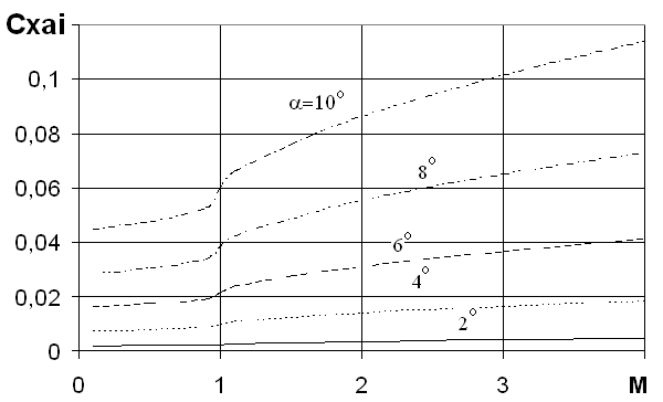 Рисунок 11 - Коэффициент индуктивного сопротивления летательного аппарата для углов атаки 2, 4, 6, 8, 10 градусов
