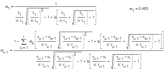 , под некоторым углом атаки α и одновременно вращается с угловой скоростью Исходные данные для расчета: M¥ =1.5; xk =7.5 м; xмид =4.5; хм =5; rмид =1.5. Корпус разбиваем на n=15 частей. Расчет первых трех точек в MathCAD: